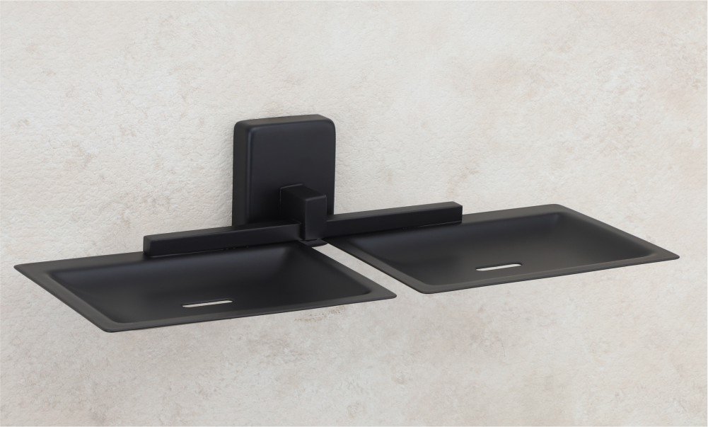 Designed with a sleek black matte finish, the Vencia Double Soap Dish offers dual compartments for efficient soap storage. It adds a modern touch to your bathroom while keeping essentials organized.