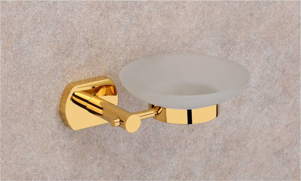 This sleek wall-mounted soap dish features a frosted glass design with a gold-colored metallic holder. Its modern aesthetic makes it a perfect addition to contemporary bathrooms, combining functionality with style.