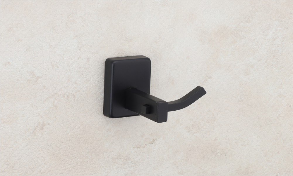 The Vencia Robe Hook features a contemporary black matte finish, combining durability with modern style for hanging robes or towels conveniently in your bathroom or bedroom.